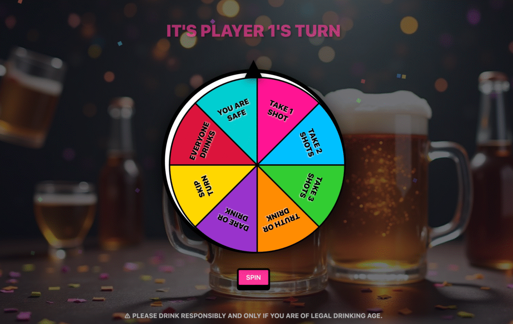 The pointer decides your fate 🎯: TAKE ONE SHOT 🥃, DOUBLE SHOT 💥, TRUTH OR DRINK 🤐, SKIP A TURN ⏭️, EVERYONE DRINKS 🍻 and more.